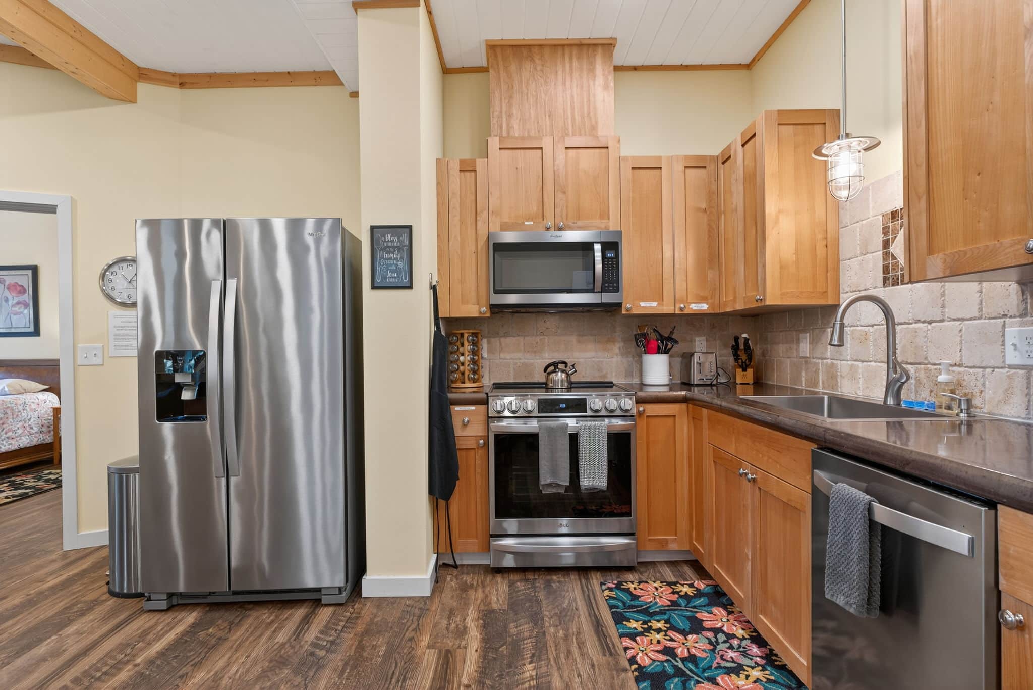 We have a well-equipped kitchen: It is unlikely you would need to bring any cooking equipment. We have a mixer, blender, waffle maker, rice cooker, instant pot, lots of bakeware and pots and pans… Olive oil, spices, a few basic baking and food storage items… We have Keurig coffee makers and coffee pods for guest use on both levels.